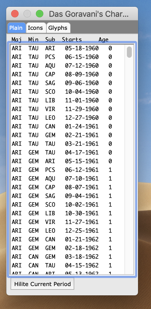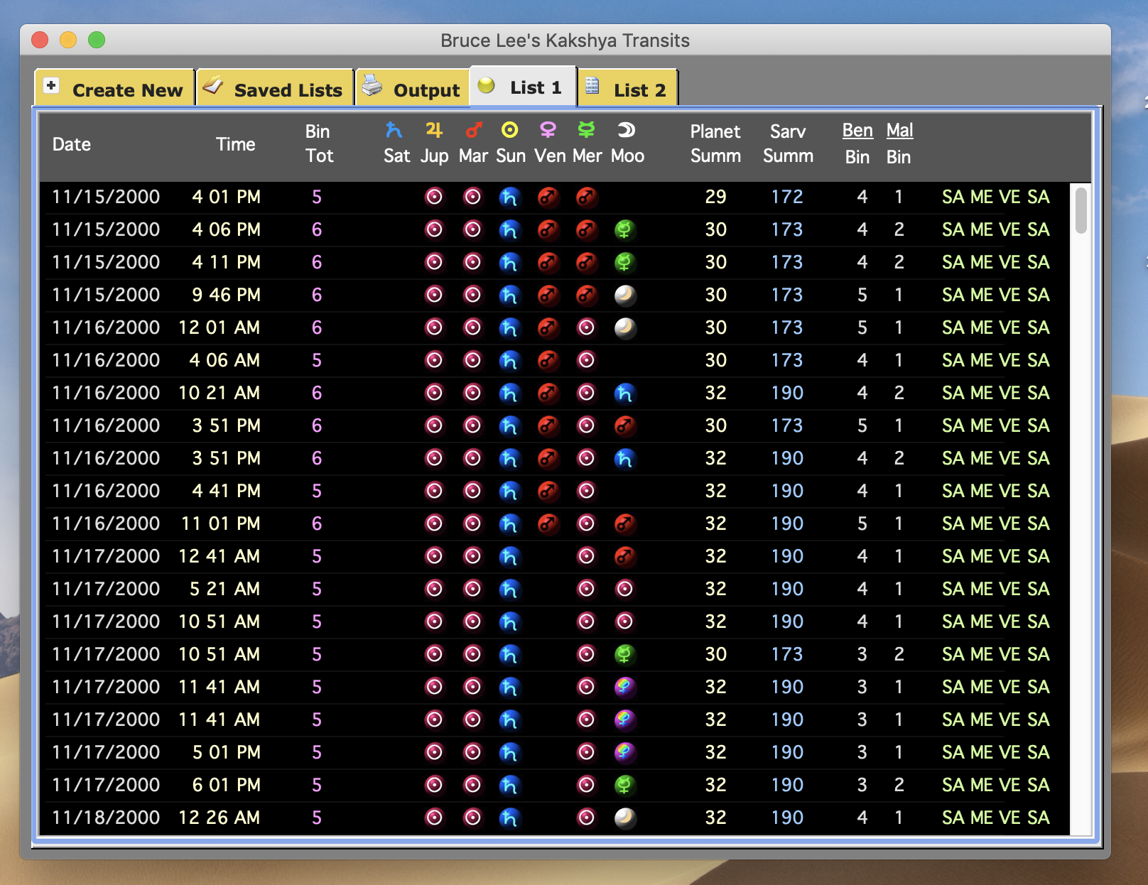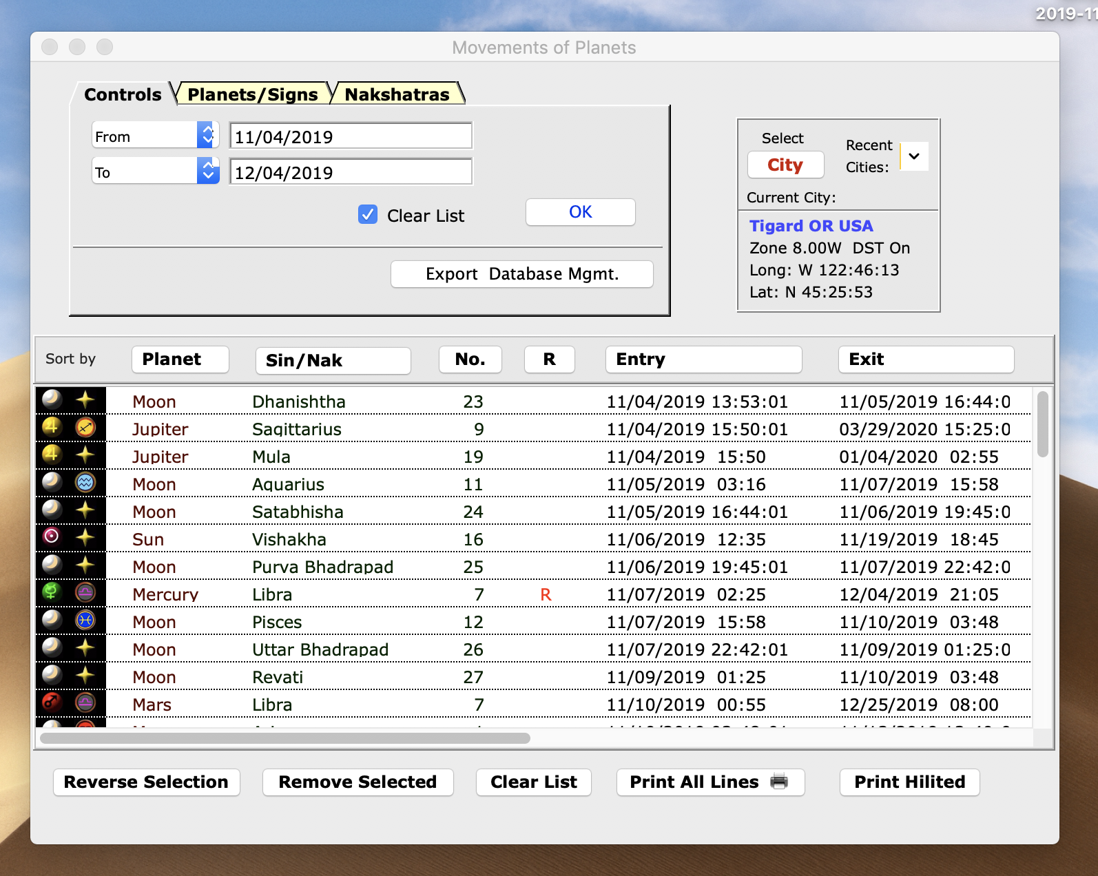 This is the Entries Exits feature… it tells you when the planets enter and exit the signs and nakshatras for any date range you specify, you can also specify which signs and nakshatras you are interested in, so you could put your moon Nakshatra for example and know when your Sada Sati's occur that way..