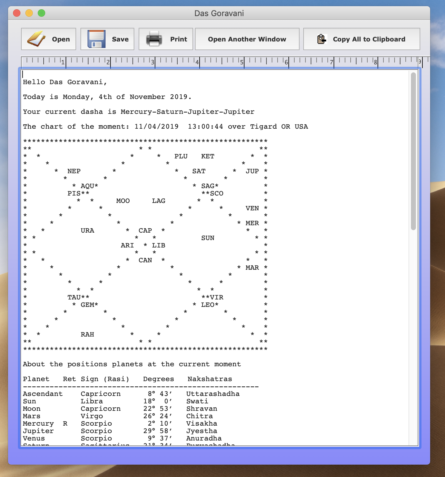 You can output the chart in text form completely, all data comes out, charts, dashes, planet lists, much other info. You can copy paste this into email for example. Even the readings come further down than what is visible in this picture.. everything comes out in this feature, very good for communications.
