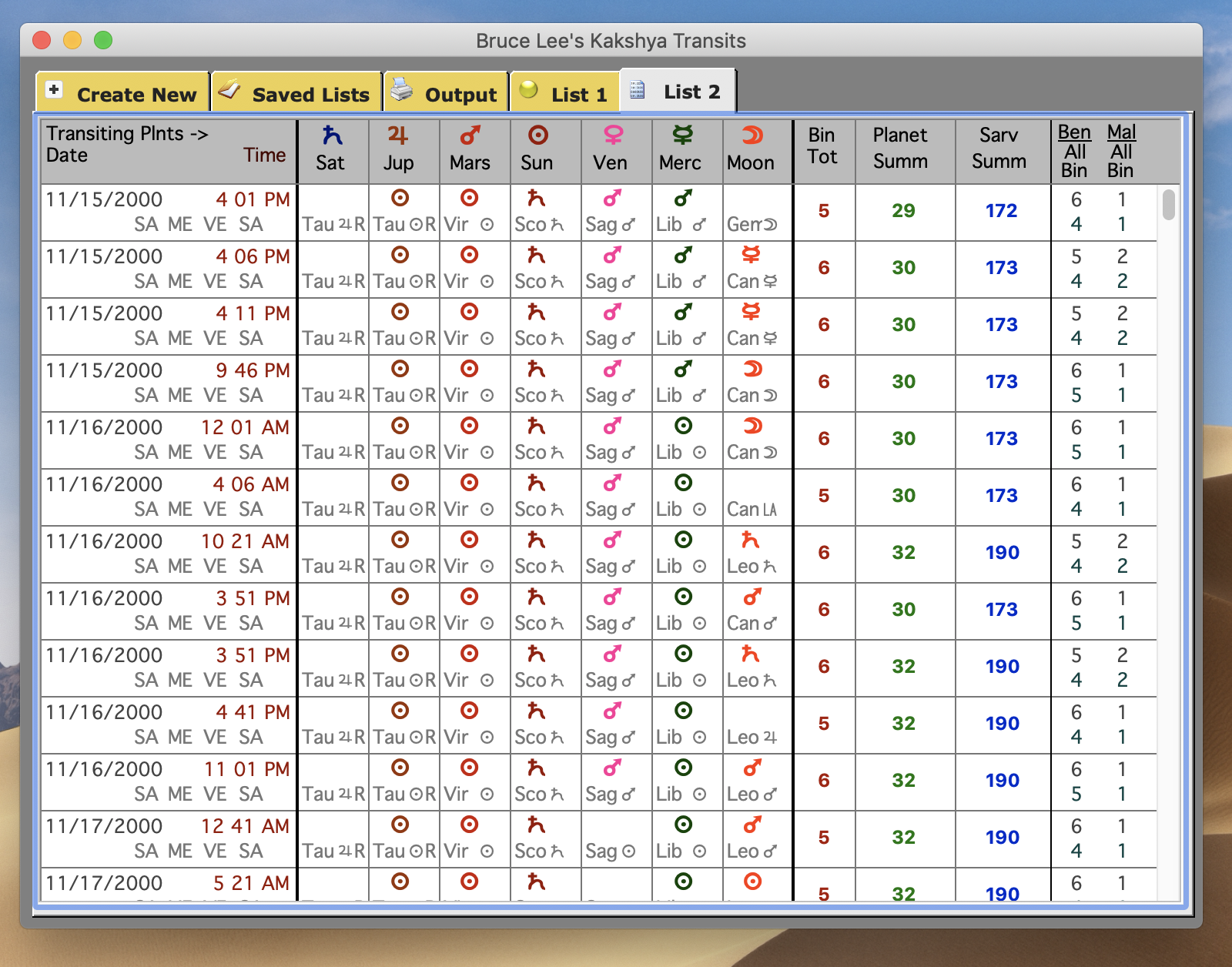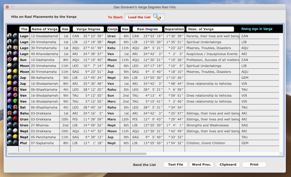 This window shows HITS the planets make from the Varga charts upon the Rasi chart… so if a placement in a Varga chart is close to a placement in the Rasi chart then it gets listed here.