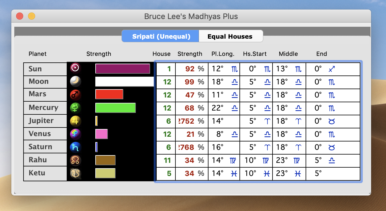 This window is called Madhyas Plus, for it gives you the beginning middle and ends of the house's, are what percentage of closeness the planets have to the middle of the houses, and a graph representing that too, the longer bar means closer to the middle of the house it is in.
