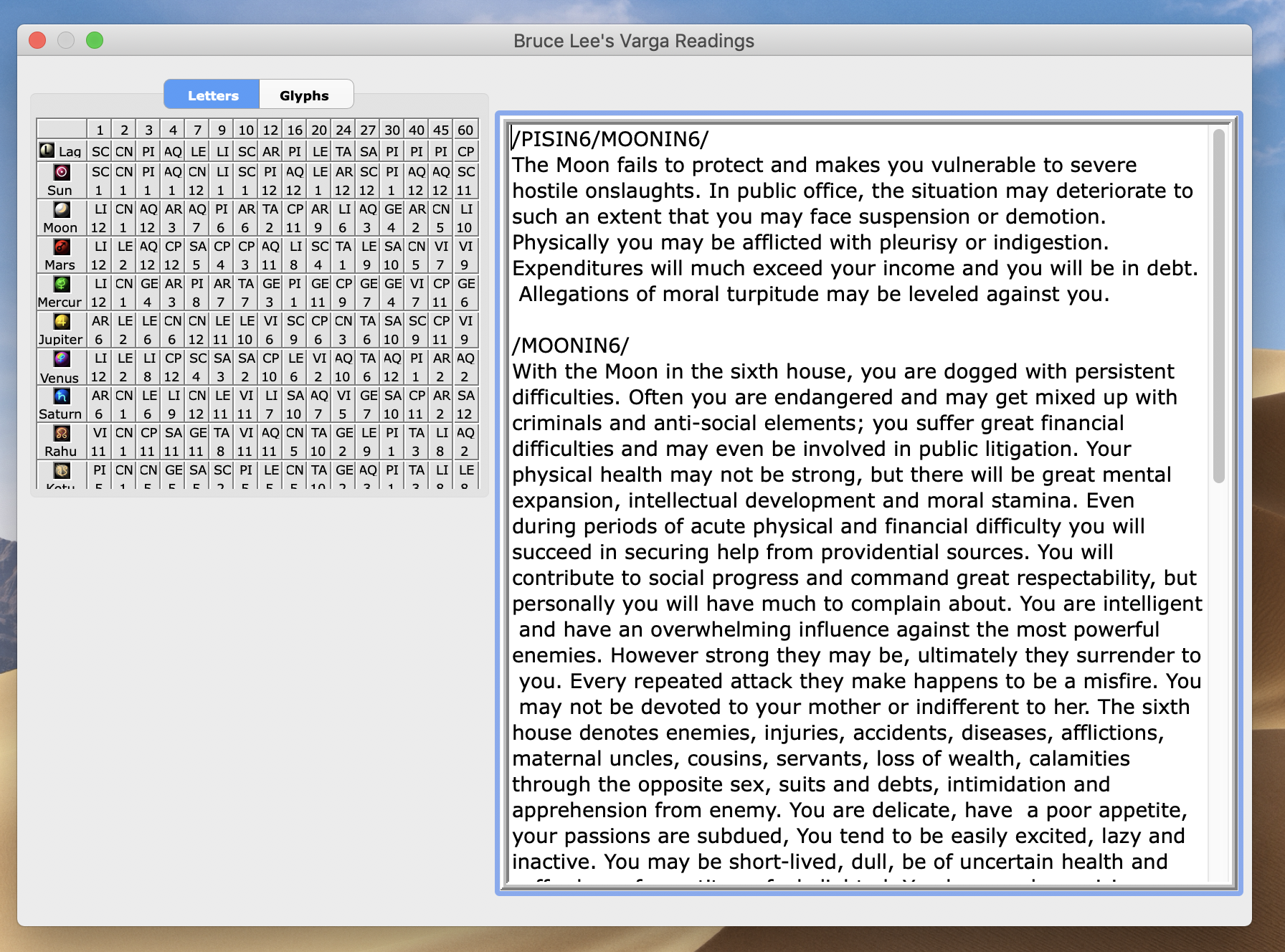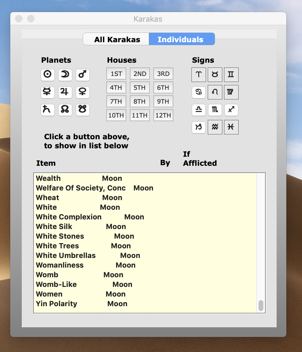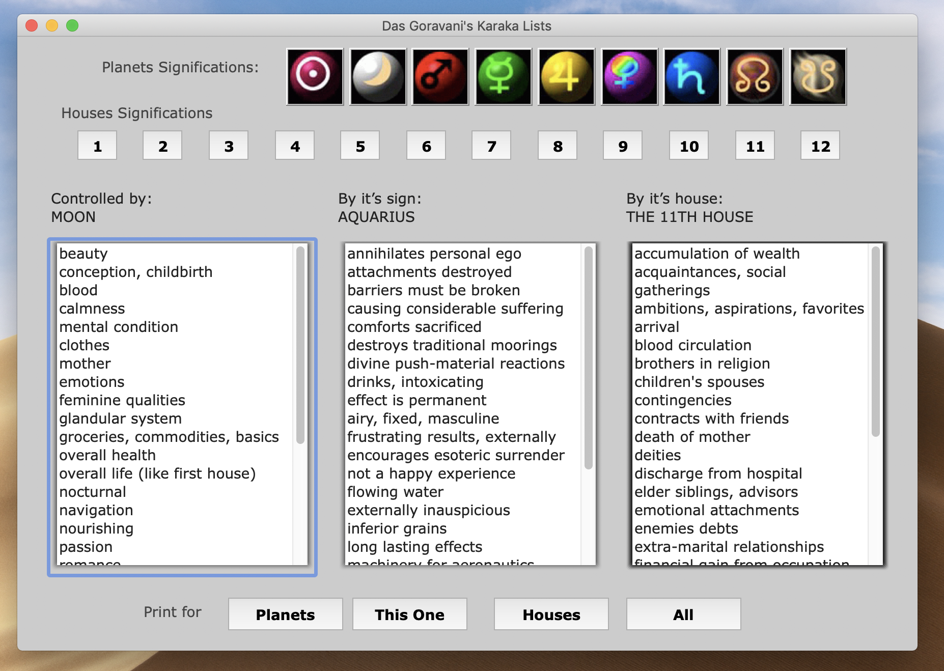 Here we have the Karakas again but this time they are for a persons chart, you still click a planet or a house, but it knows the sign then too, and shows for the planet, sign and house no matter what you click.. you direct it but it shows all three always, very handy for combining from the three columns to come up with sentences that apply to the chart.