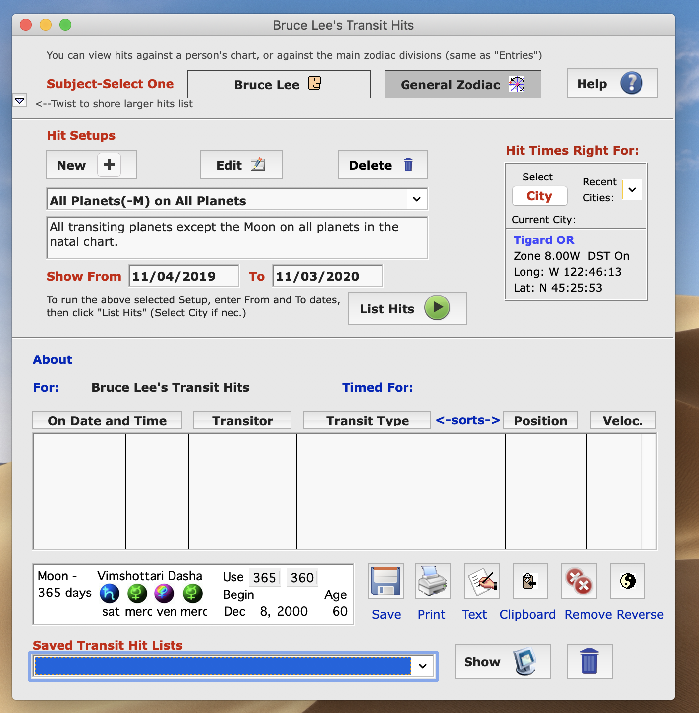 This is the Transit Hits window, which is very powerful and able to do it's job. It's not filled in in the above picture, but at the bottom would be displayed your list of transit hits that comes from a Transit Hits Setup that you make at the top first. Outputs to text of course, and all other normal ways, print, PDF, etc. Very good feature, very powerful.