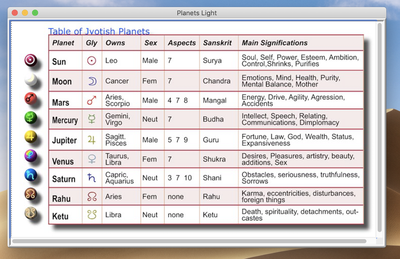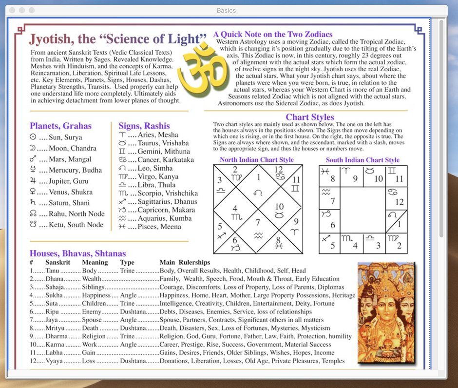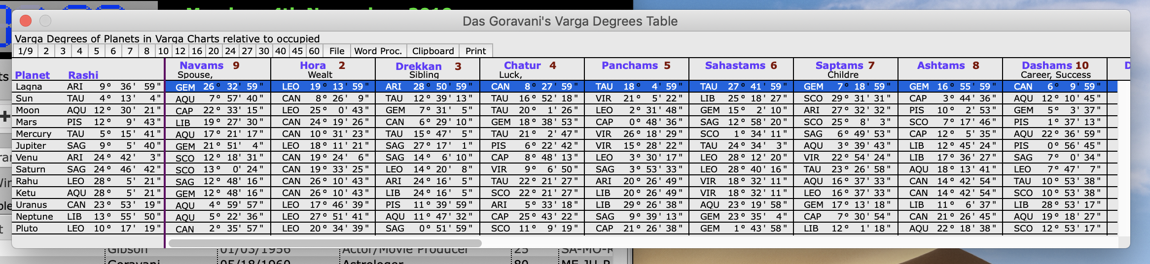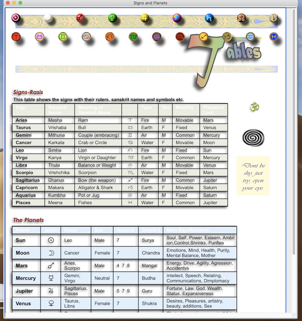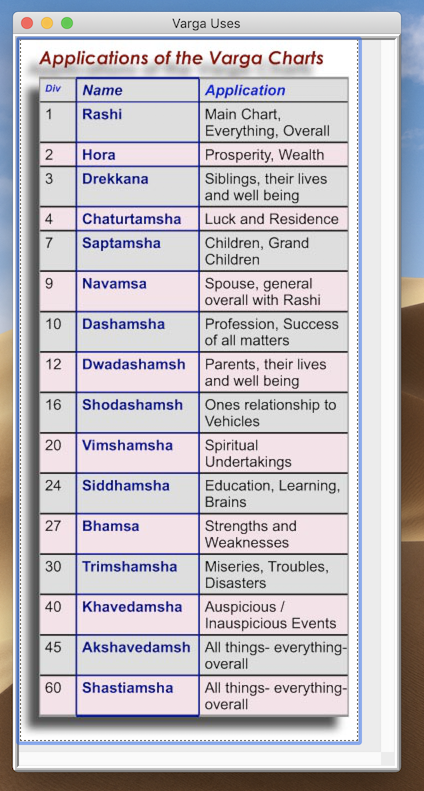Now the pictures above and all below to the end of the page are from the built in learning resources, guides, to help you learn or lookup something about Jyotish. Above is a general information window, that is basic, below is the usage of the Varga charts table.
