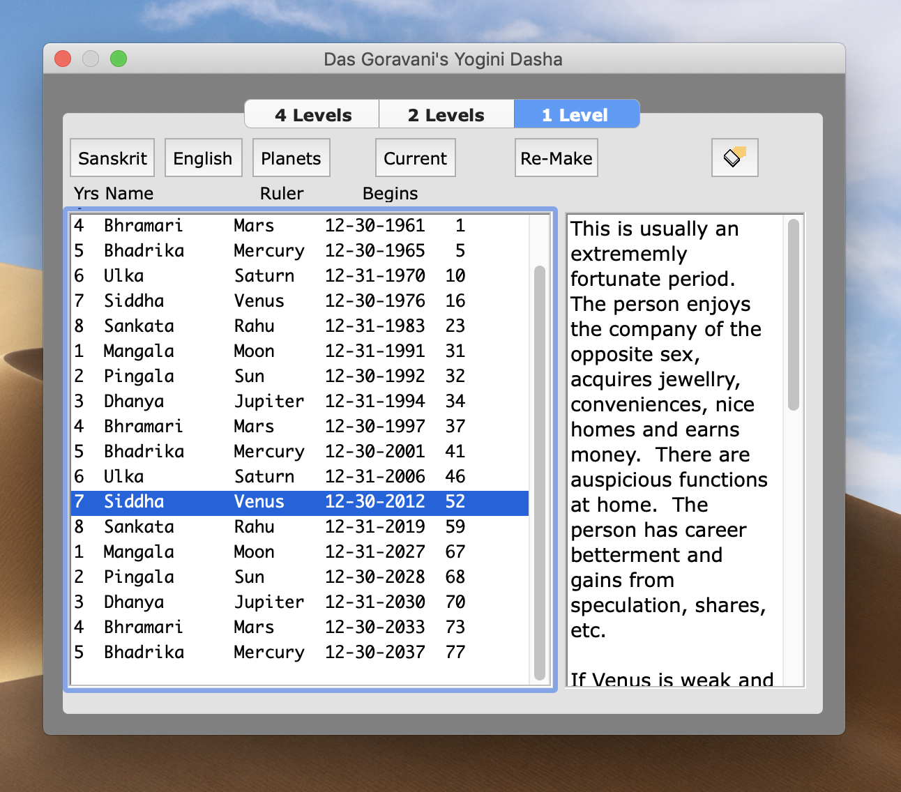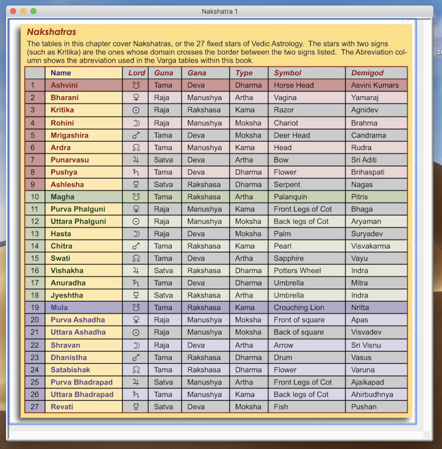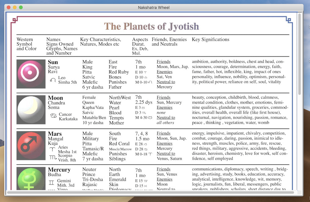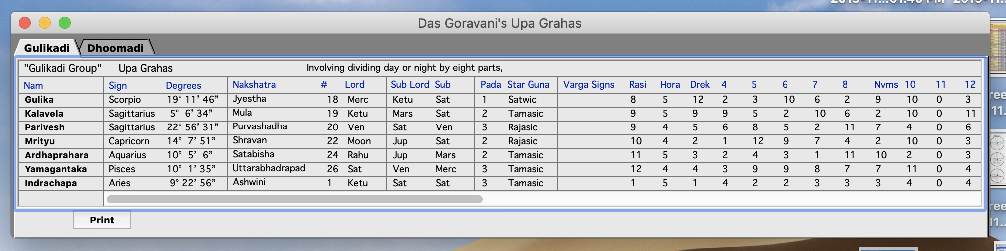 Now the pictures above and all below to the end of the page are from the built in learning resources, guides, to help you learn or lookup something about Jyotish. Above is a general information window, that is basic, below is the usage of the Varga charts table.