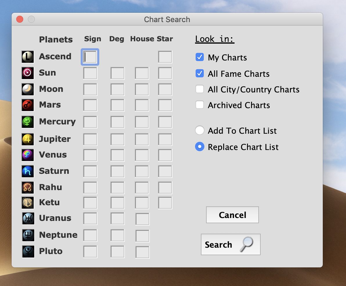 This is the Power Search feature window. Here you put simple numbers into the fields, usually filling out only one or two of them, you could for example search for everyone who has Jupiter in the 9th, by putting a 9 underneath the house column next to Jupiter.. you could add a sign, to make the search be for House and Sign, as you can see you can search the Famous chart file.. if you have calculated all of them (easy to do) then you will find from among them. In this way I did research as to who has my chart placements, to see what those placements cause in real life. It's a very interesting feature.