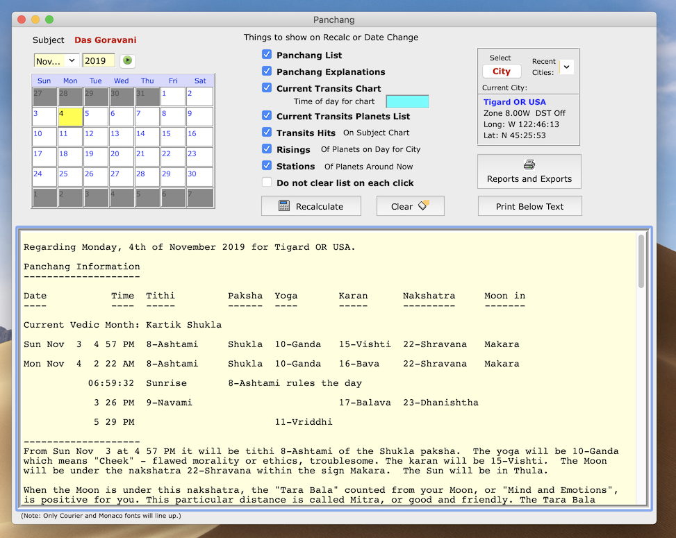 This is the "Panchang Plus" window. It's very powerful in terms of Panchang and related data. The yellow area is where the output shows, and you can copy paste directly from there.. it's pure text, you can choose what things you want via the checkboxes top middle.. you can click the Calendar to see Panchang data for that particular day, there are various reports behind the buttons. Panchang is covered completely and nicely via this feature.