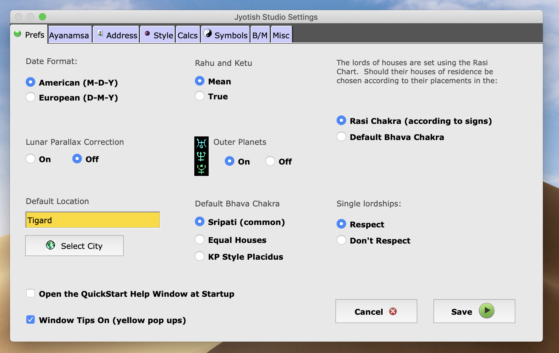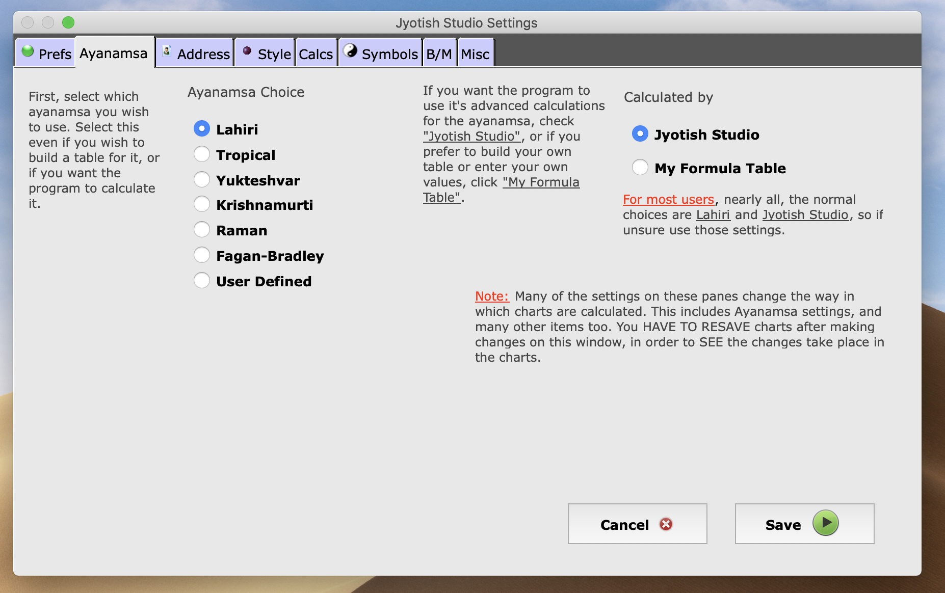 Above and below are two of the Tab Panes from the Settings Window, where you put in your choices for the various options the program offers. Below you can choose the default ayanamsa, which you can override when entering a chart, you can define your own ayanamsa too, not fully shown, you have to click the button for it then it shows in the open area near the bottom. But you can define ayanamsas