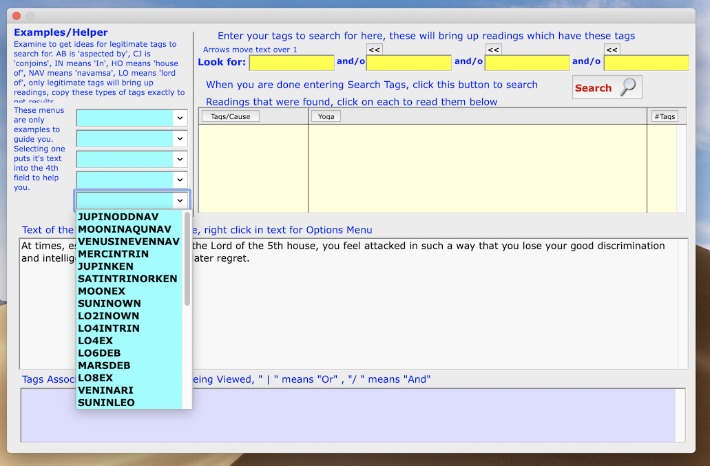 Above is the Search the Readings Database feature. It allows you to search via our tagging system, some tags are shown in the blue example menu shown at left in the pic. You can search for readings by up to 4 tags which is plenty.