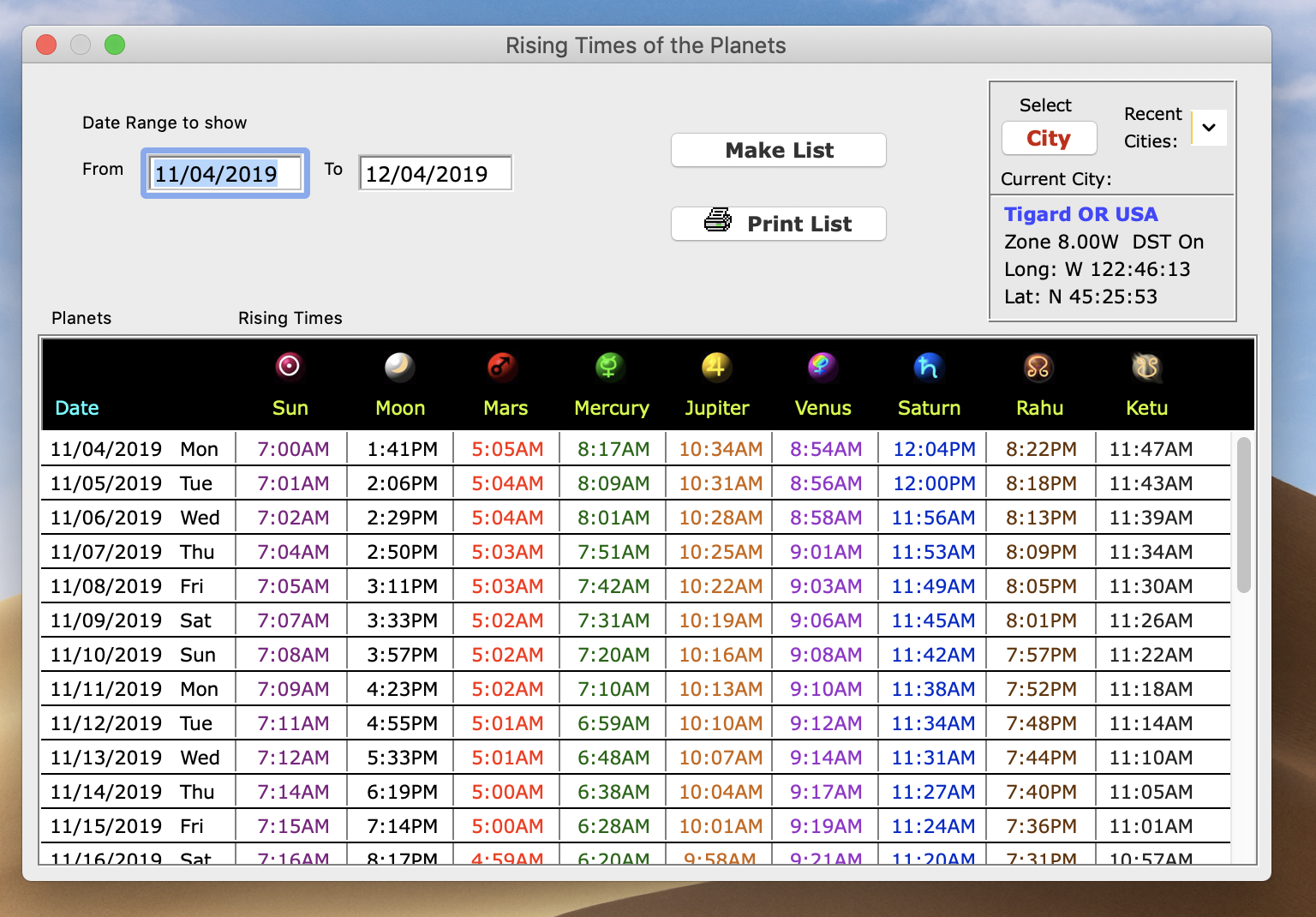 Rising Time of the Planets.. you input the date range, and it gives you the rising time for the selected city.