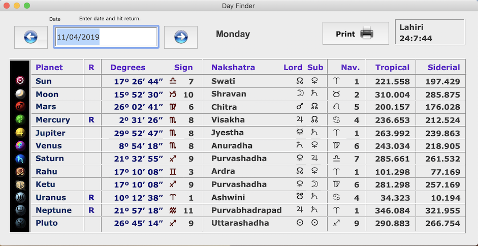 This is the Ephemeris window. It shows you very well what sign and Nakshatra, lord and sub lord, etc.. positions of the planets on a given day, an ephemeris.